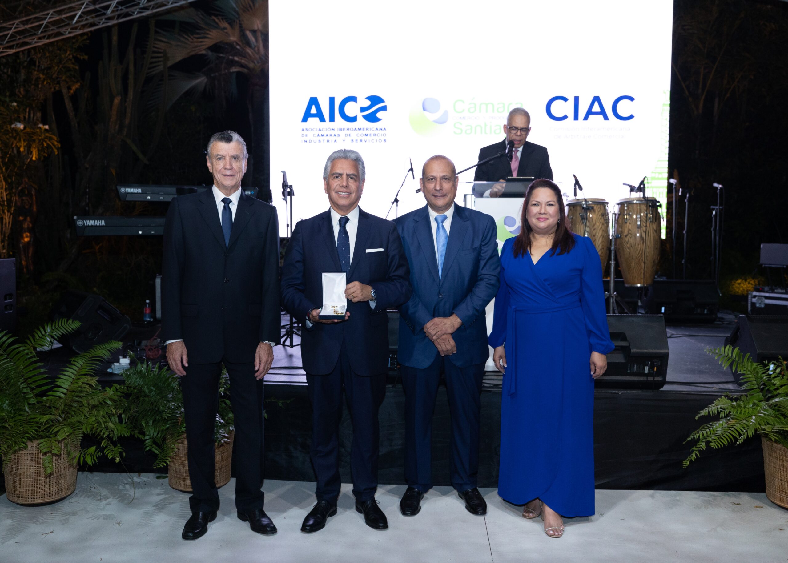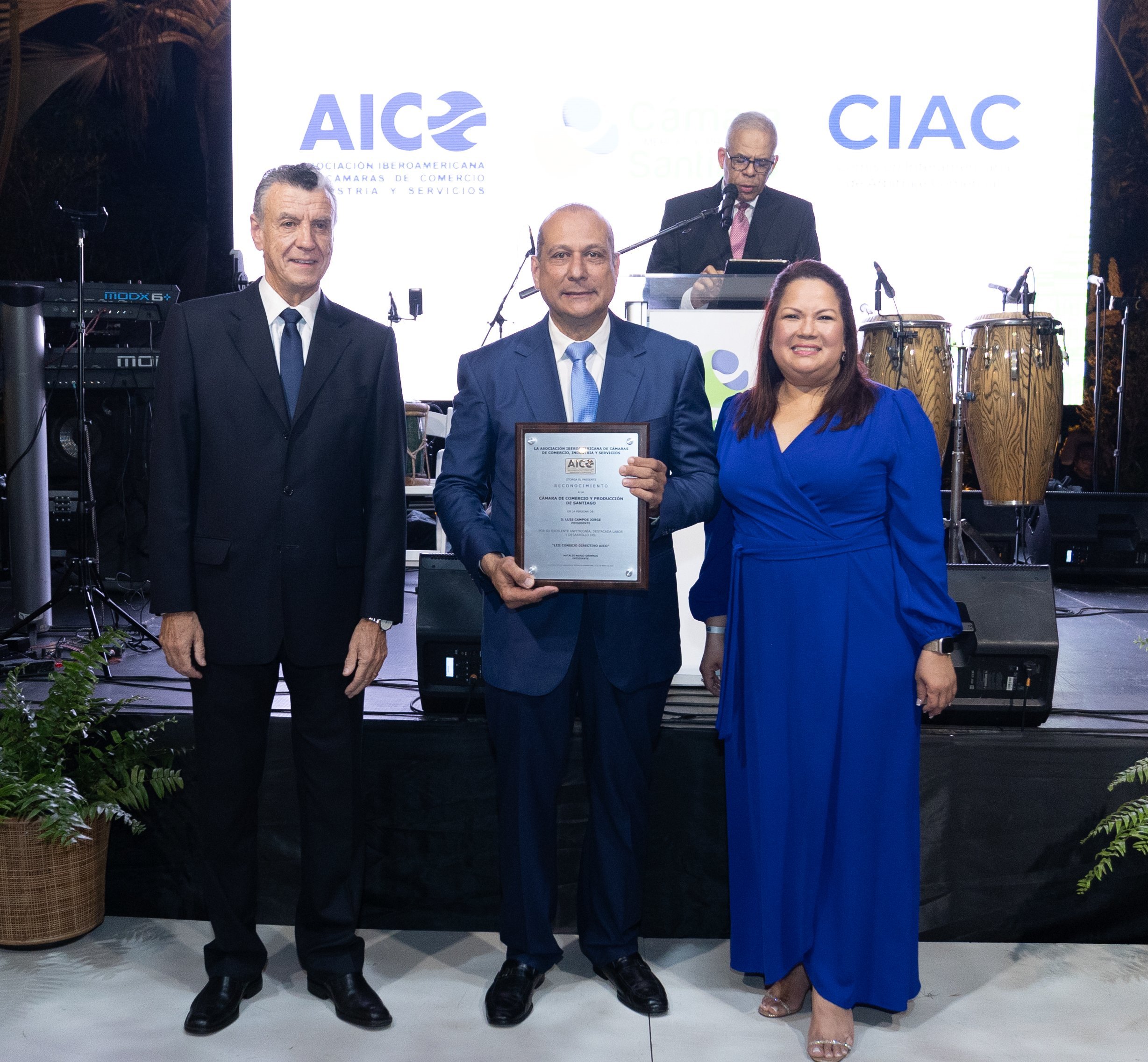 El presidente de AICO hizo entrega de una placa de reconocimiento a Luis Campos como máximo representante de la Cámara de Comercio y Producción de Santiago, por su excelente anfitrionía.