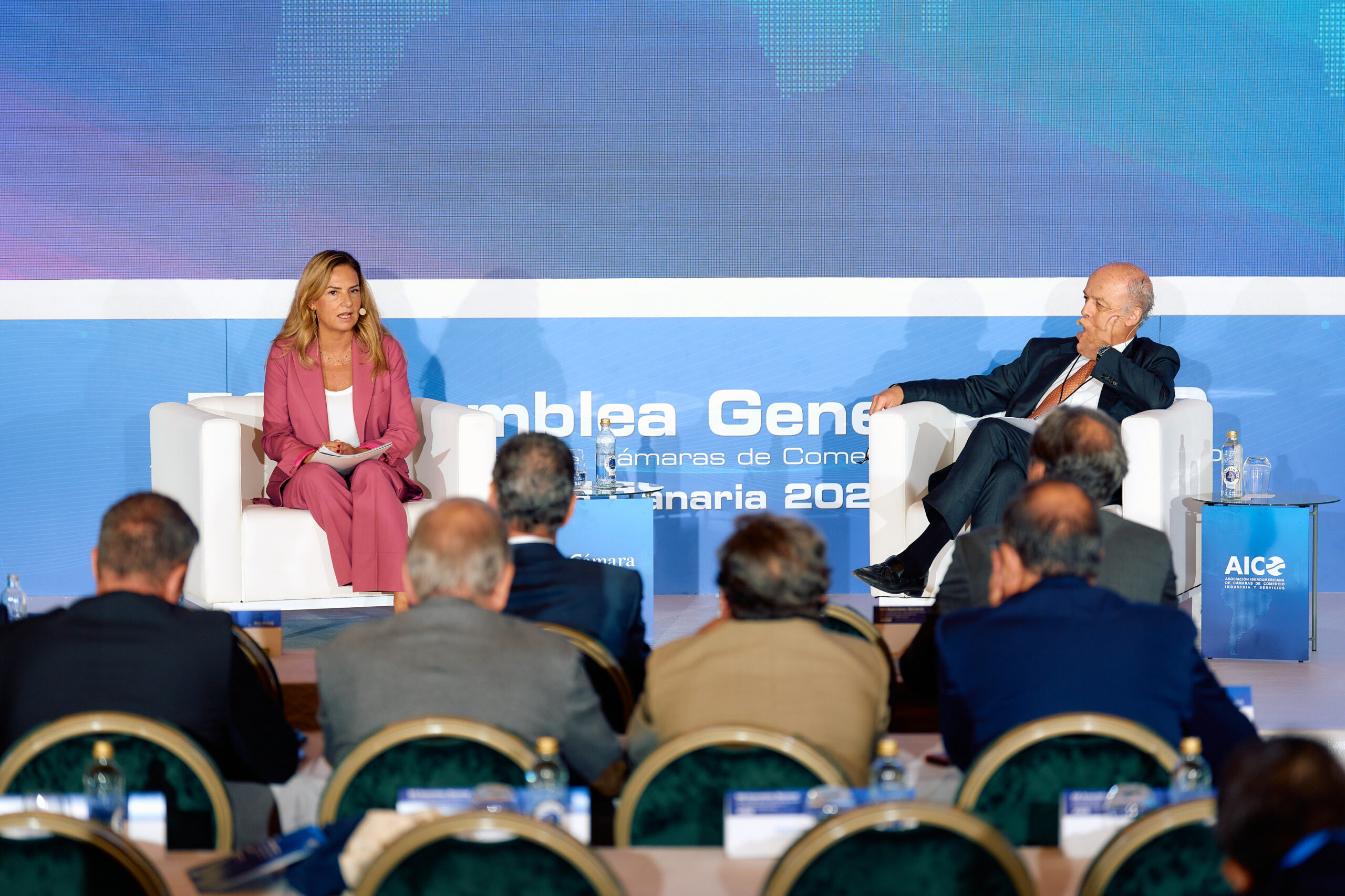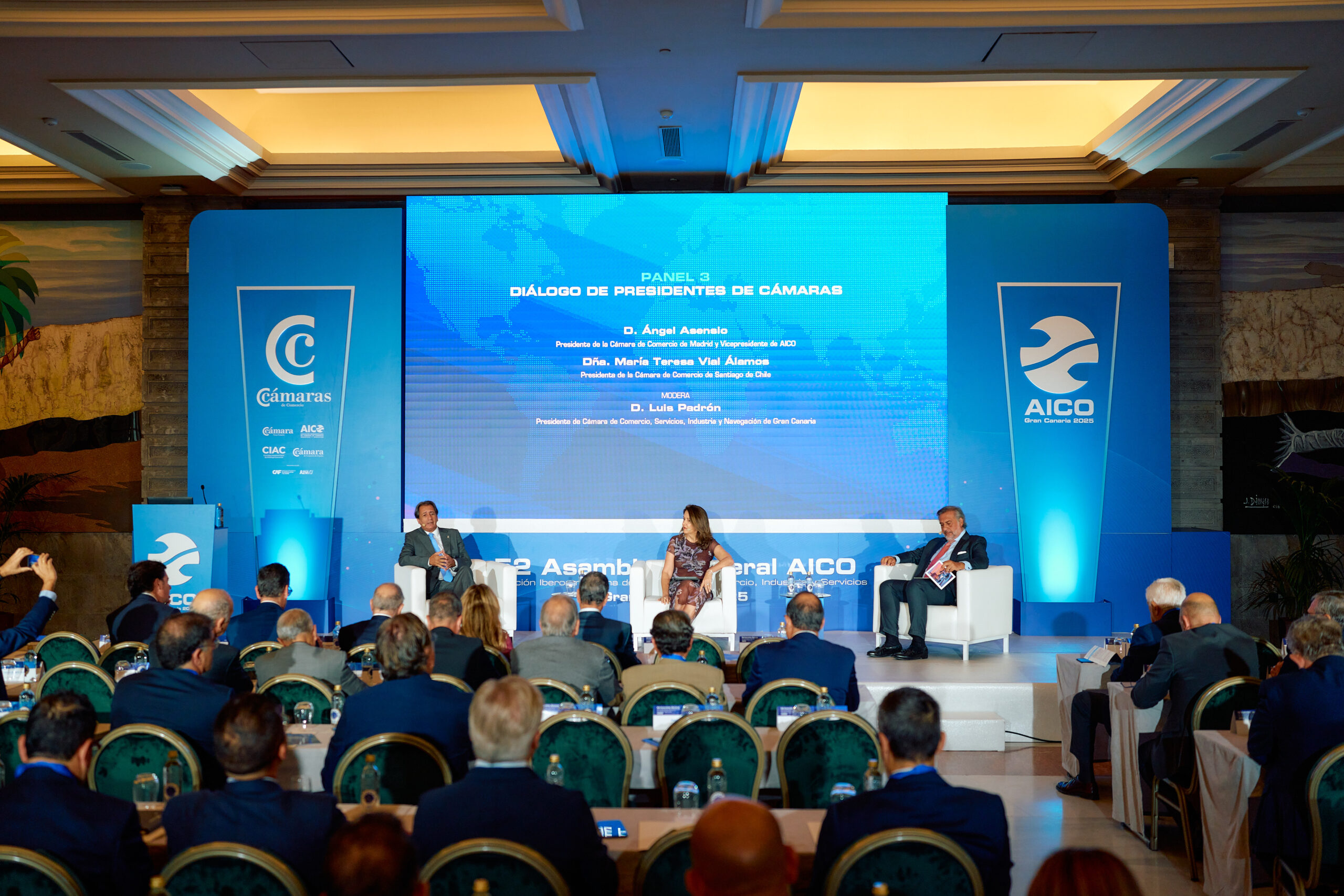 Ángel Asensio, Presidente de la Cámara Oficial de Comercio, Industria y Servicios de Madrid y Vicepresidente de AICO, junto a María Teresa Vial Álamos, Presidenta de la Cámara de Comercio de Santiago, Chile y Vicepresidenta de AICO, moderados por Luis Padrón, plasmaron el liderazgo empresarial y la acción directa de las cámaras de comercio como entidades clave en la dinamización económica de sus territorios y en la construcción de relaciones transnacionales.