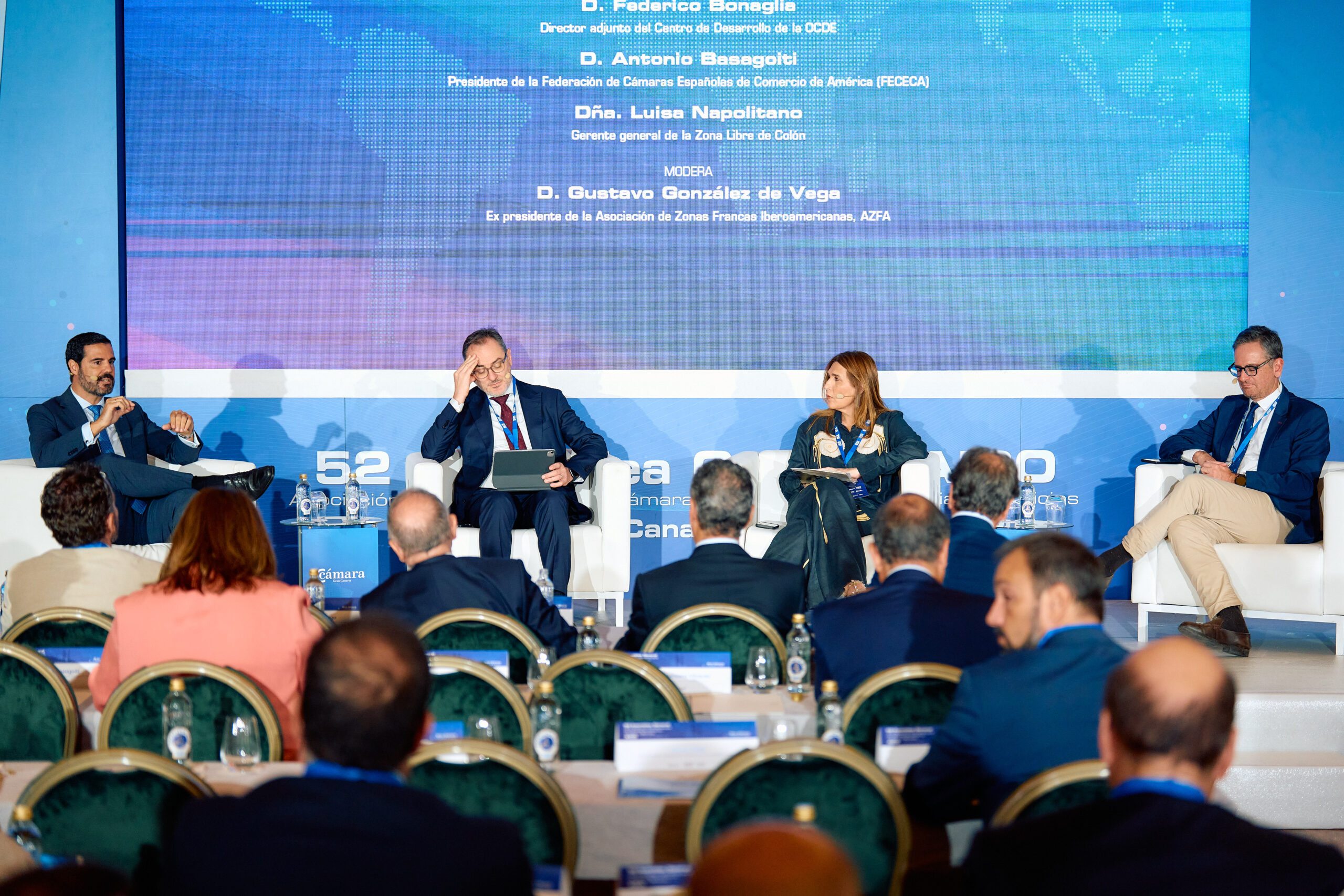 Gustavo González, Ex Presidente de la Asociación de Zonas Francas Iberoamericanas (AZFA) (moderador), Federico Bonaglia, Director Adjunto del Centro de Desarrollo de la OCDE, Luisa Napolitano, Gerente General de la Zona Libre de Colón, Panamá, y Antonio Basagoiti, Presidente de la Federación de Cámaras Españolas de Comercio de América (FECECA)